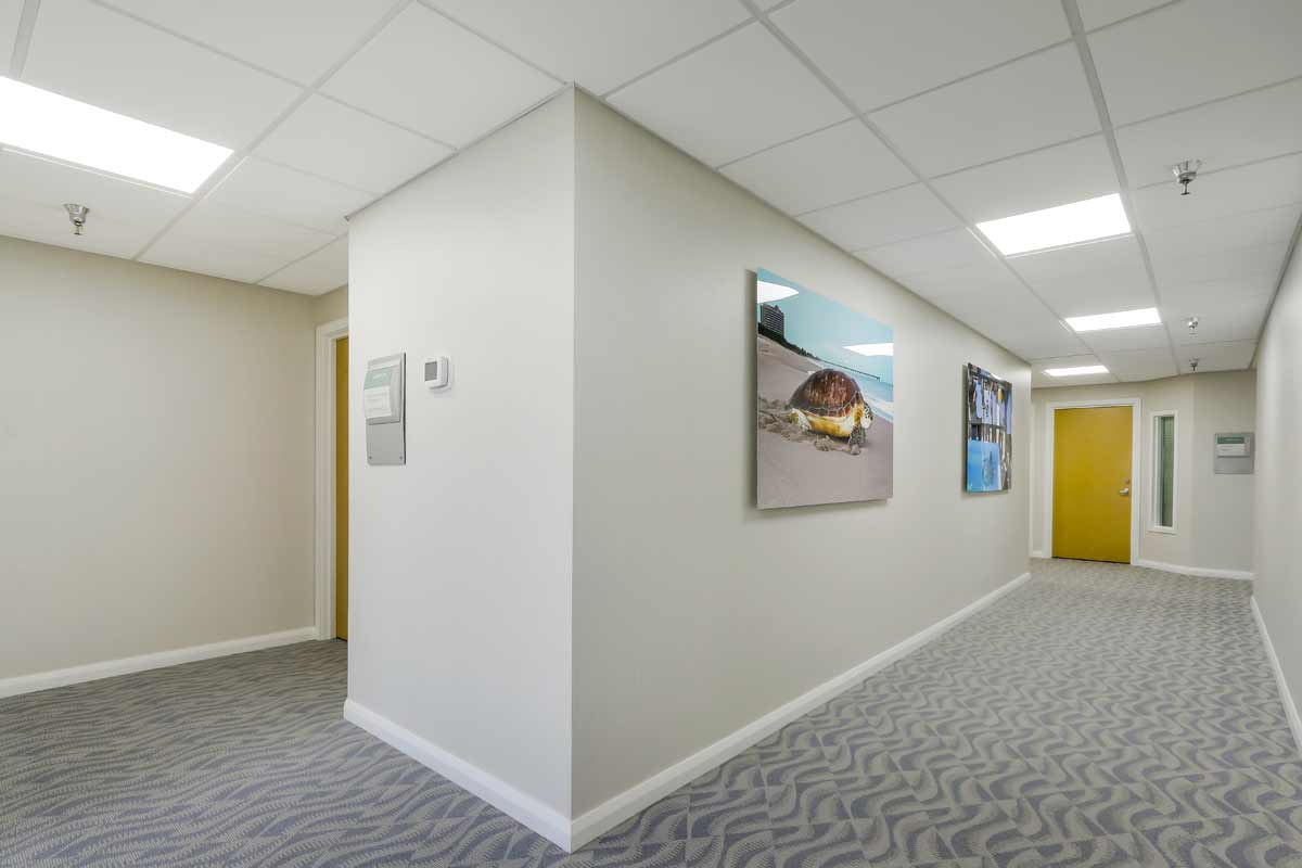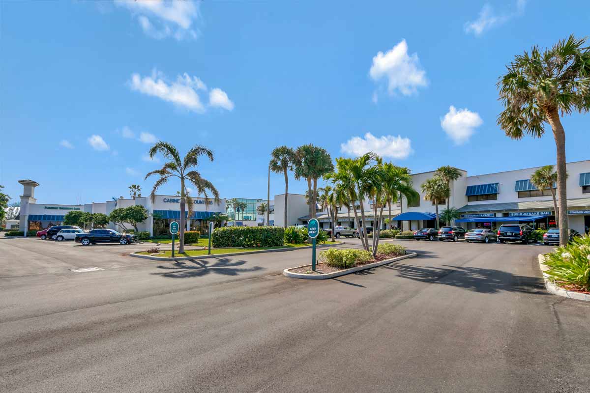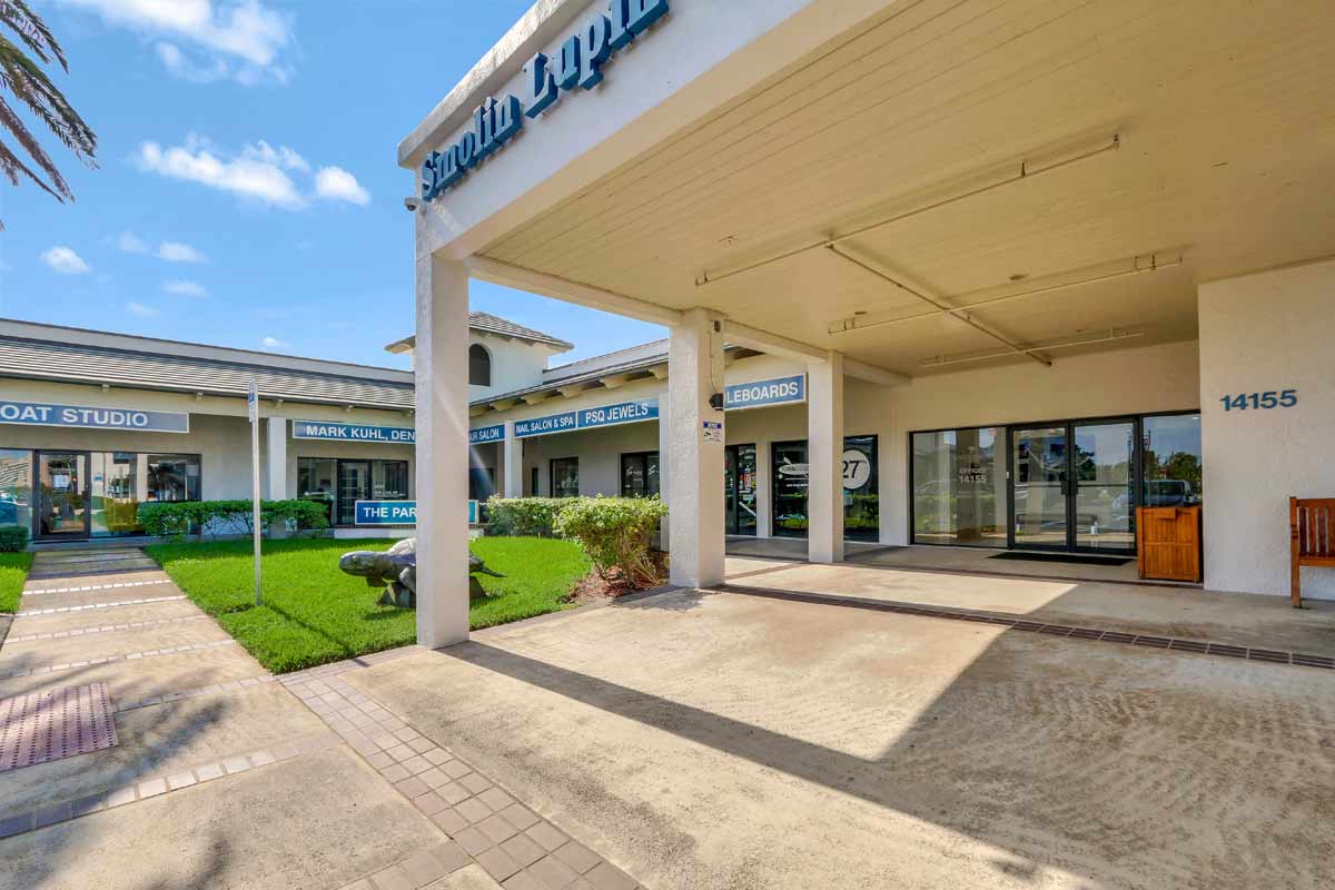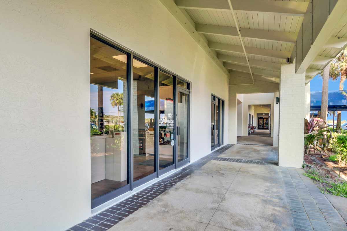 Glass building in Loggerhead Plaza, with retail spaces on ground floor and offices on second floor