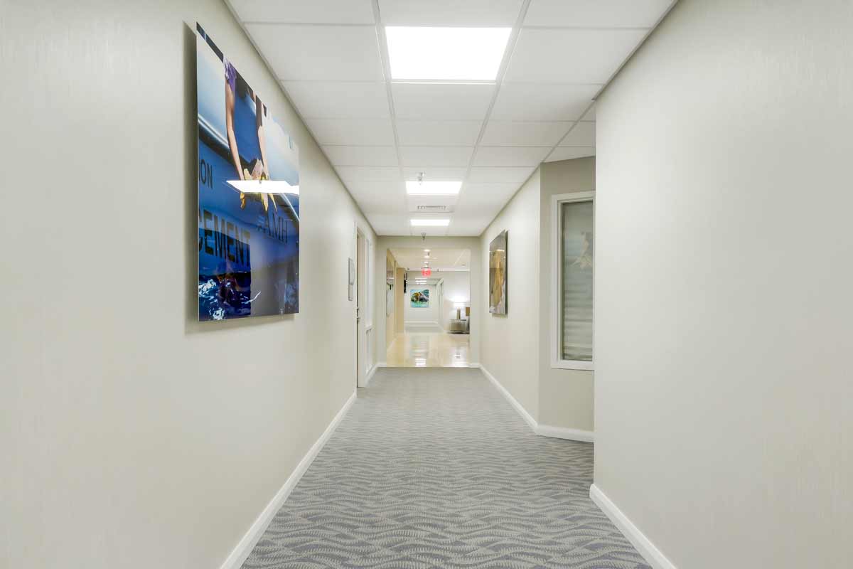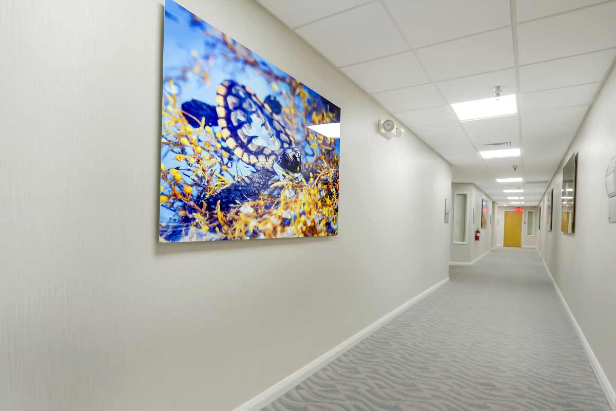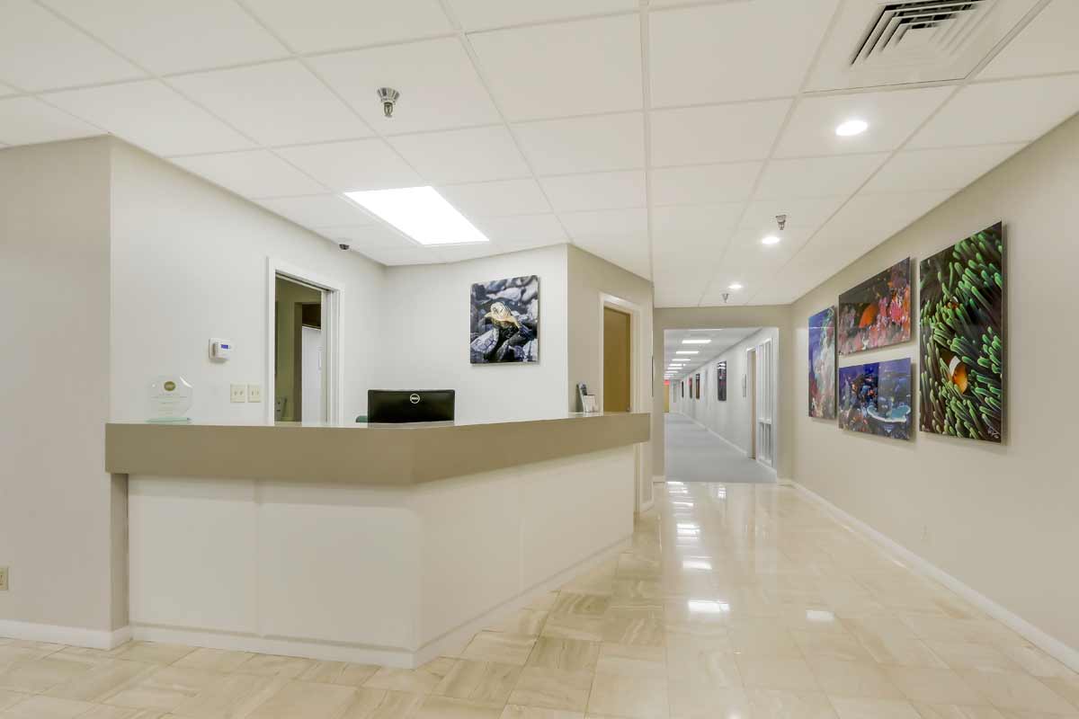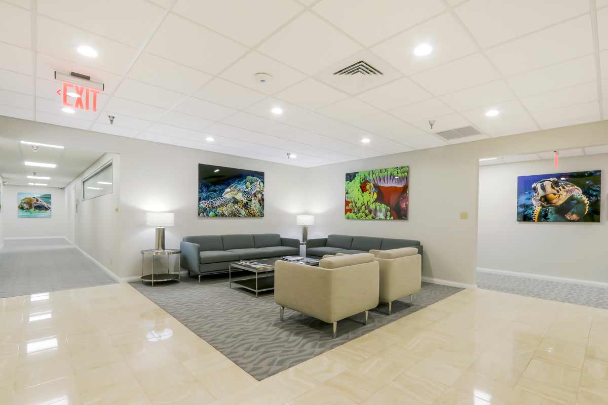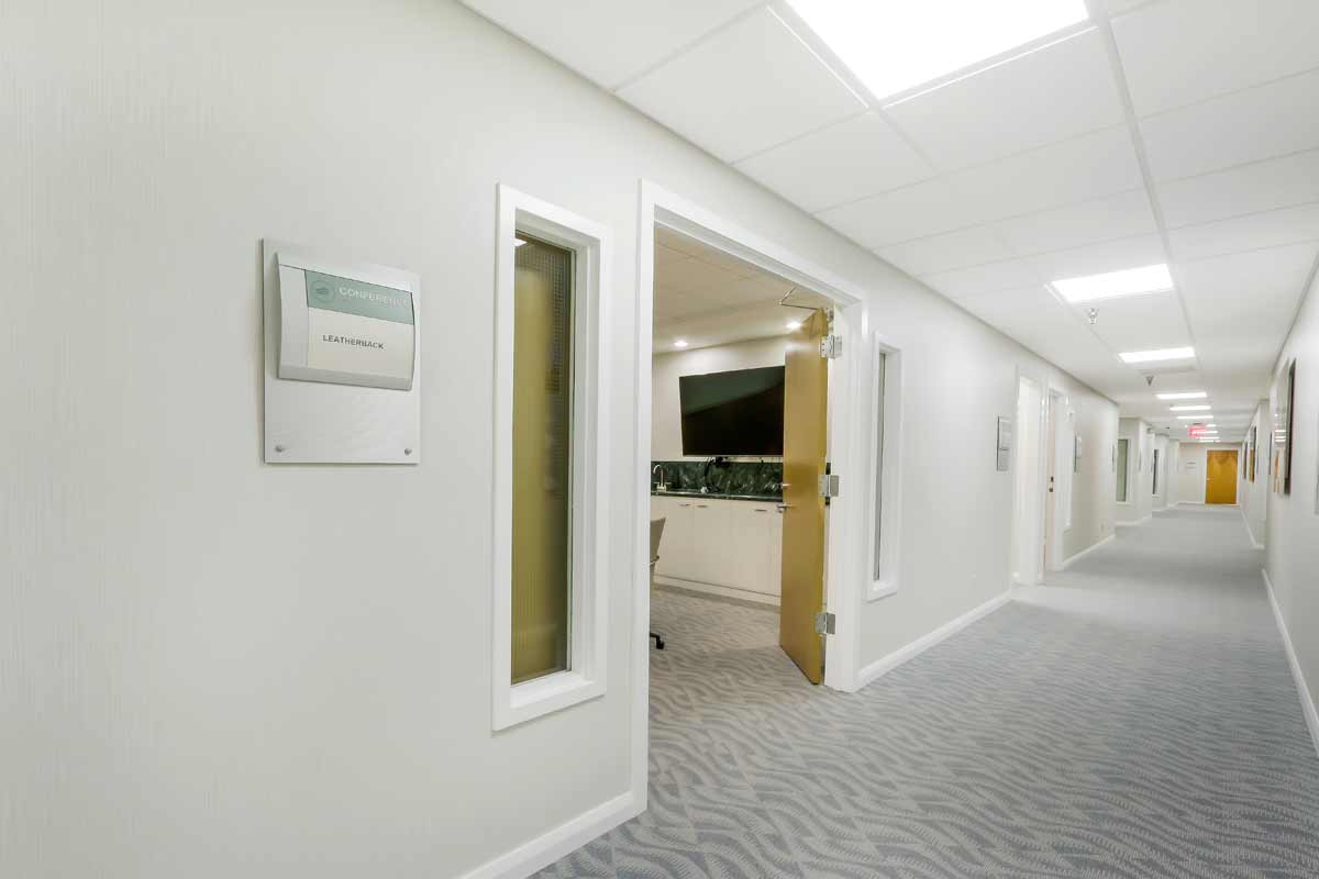 Glass building in Loggerhead Plaza, with retail spaces on ground floor and offices on second floor